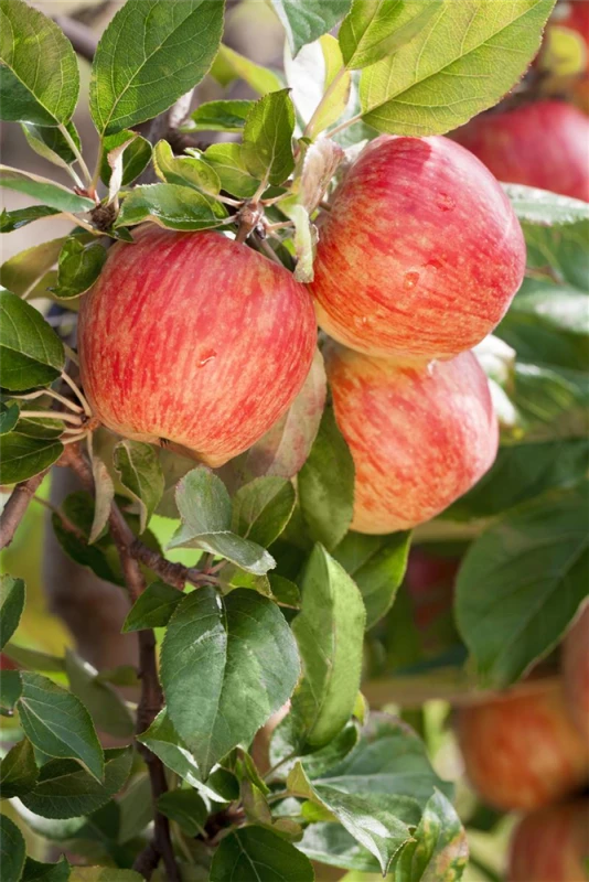 Apfel ‚Gala‘ ist ein aufrecht und breit wachsender Kleinbaum. Er erreicht gewöhnlich eine Höhe von 3 – 4 m und wird ca. 2 – 3 m breit. In der Regel wächst er 30 – 40 cm pro Jahr.