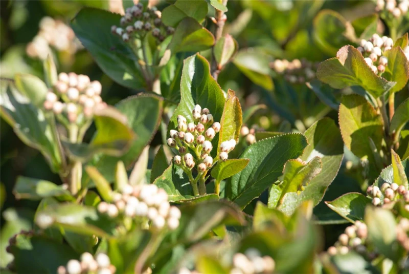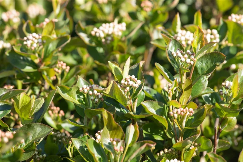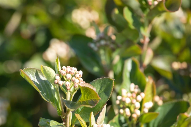 Die weißen Blüten der Apfelbeere ‚Aron‘ erscheinen in Rispen im Mai.