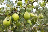 Pyrus communis ‚Alexander Lucas‘ bildet gelb-grüne Früchte.