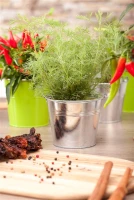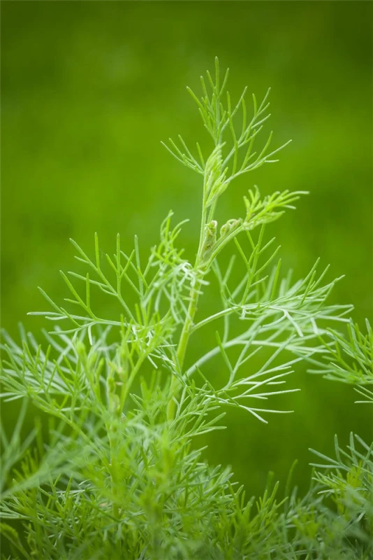 Zum Verzehr geeignet. Die grau-grünen Blätter sind gefiedert und überzeugen mit aromatischem Geschmack.