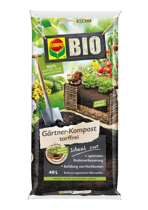 Der COMPO BIO Gärtner-Kompost ist ein hochwertiger und sehr gut zersetzter Grünkompost, frei von Unkraut in bester Gärtnerqualität. Er garantiert den wertvollen Humusanteil und sorgt somit für eine langfristige organische Düngung. Neben der Durchlüftung des Bodens erhöht sich die Wasserspeicherkapazität, und die Nährstoffe werden gehalten. Der COMPO BIO Gärtner-Kompost sorgt sowohl im Hochbeet als auch im Garten für eine Intensivierung der Bodenaktivität und somit für einen rundum fruchtbaren Boden. Anwendung: Sachgerechte Anwendung: Zur Anlage eines Hochbeetes wird der Bio Kompost auf die erste Schicht aus Holzschnitzel oder sonstigen zerkleinerten Schnittmaterialien aufgebracht. In der Regel können ca. 1-3 l/m² aufgebracht werden. Gehölzpflanzungen reicht man ca. 1 l/m² und Stauden ca. 2 l/m². Zur Pflanzlochbeigabe mischen Sie den Bodenaushub 1:1 mit Kompost.