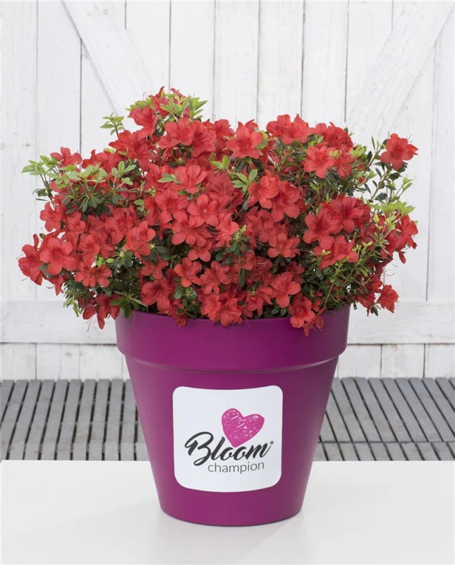 Dauerblühende Azalee ‚BloomChampion Red‘ ist ein aufrecht und gedrungen wachsender Kleinstrauch. Sie erreicht gewöhnlich eine Höhe von 0,5 – 1,5 m und wird ca. 0,5 – 1,5 m breit.