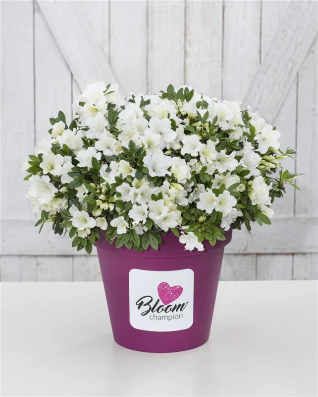 Dauerblühende Azalee ‚BloomChampion White‘ ist ein aufrecht und gedrungen wachsender Kleinstrauch. Sie erreicht gewöhnlich eine Höhe von 0,5 – 1,5 m und wird ca. 0,5 – 1,5 m breit.
