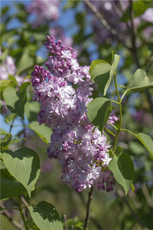 Die lilafarbenen, gefüllten Blüten des Edelflieder ‚Michel Buchner‘ erscheinen in Rispen von Mai bis Juni. Diese werden etwa 12 – 15 cm groß und sind stark duftend.