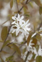 Die Felsenbirne Polar Fruits® ‚Western Juneberry‘ (Amelanchier x grandiflora) ist eine verzweigte Gartenpflanze, die weiße Blüten hervorbringt. Sie erscheinen im April. Besonders dekorativ ist der bronzefarbene Jungaustrieb. An einem sonnigen bis halbschattigen Standort mit durchlässigem Boden erreicht sie gewöhnlich eine Höhe von ca. 6 m und wird ca. 6 m breit.