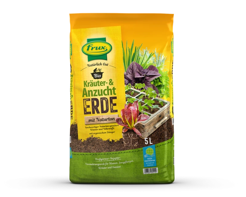 Die frux Kräuter- & Anzuchterde hat eine besonders feiner Körnung, ideal für Aussaaten, Stecklinge, zum Pikieren sowie Anzucht und Kultur von Kräuter- und Gemüsepflanzen. Effektive Mikroorganismen fördern ein gesundes Pflanzenwachstum, reiche Erträge und die natürliche Herausbildung von Aromen.