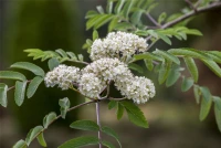Die weißen Blüten der Gewöhnlichen Eberesche erscheinen in Rispen von Mai bis Juni.