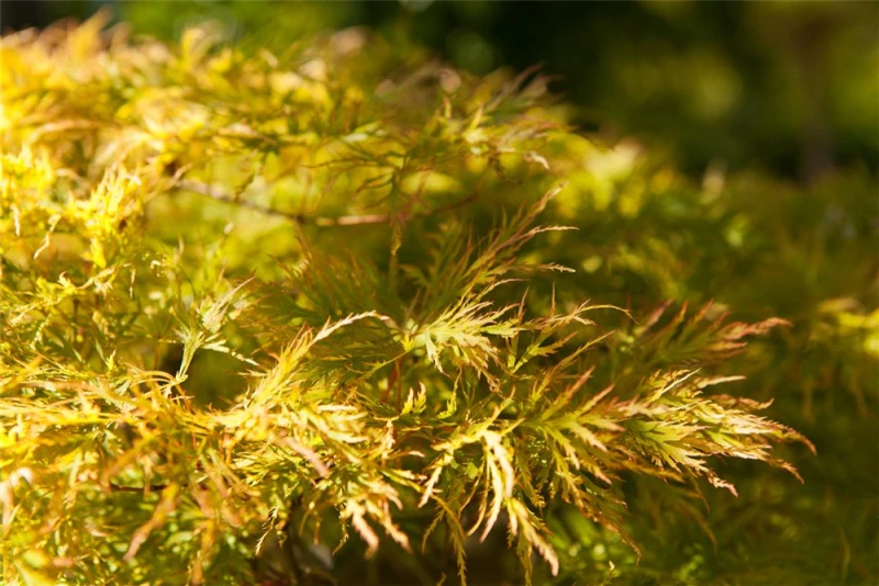 Hoher Blattschmuckwert. Die sommergrünen Blätter des Grünen Schlitzahorns ‚Dissectum‘ sind hellgrün, tief geschlitzt, gegenständig. Diese sind etwa 6 – 11 cm groß. Grüner Schlitzahorn ‚Dissectum‘ zeigt sich leuchtend orange-rot im Herbst.