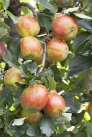 Malus domestica ‚Holsteiner Cox‘ bildet gelb-rote, runde Früchte.