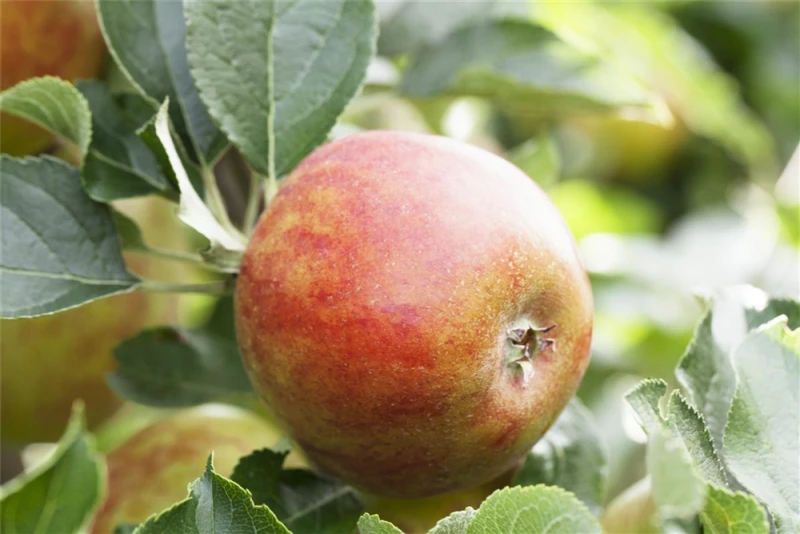 Der Herbstapfel ‚Holsteiner Cox‘ (Malus domestica) bildet gelb-rote, mittelfeste Früchte. Sie sind rund und haben einen säuerlichen, aromatischen, mehligen Geschmack. Für eine ertragreiche Ernte ab Anfang Oktober schaffen durchlässiger, nährstoffreicher Boden und ein sonniger bis halbschattiger Standort optimale Bedingungen. Auch seine hellrosafarbenen Blüten sind eine schöne Erscheinung.