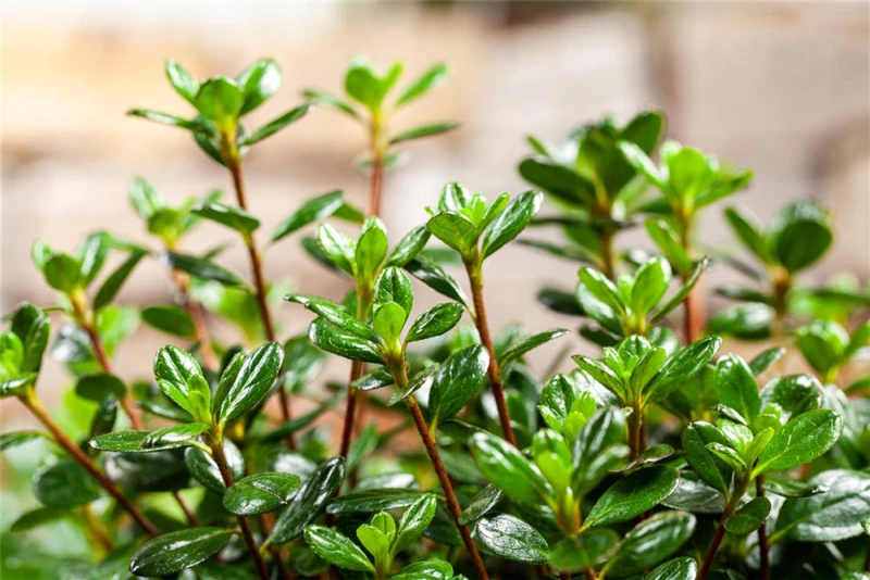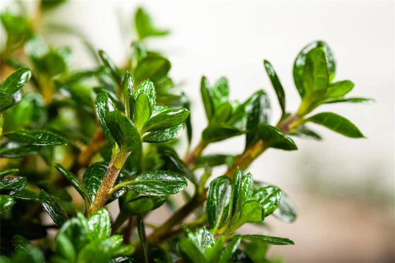 Die Japanische Azalee ‚Anouk‘ ist wintergrün und trägt dunkelgrüne, glänzende, lanzettliche, eiförmige Blätter.