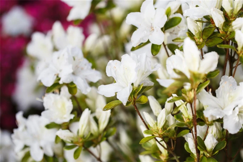Die Japanische Azalee ‚Feenkissen’®(s) (Rhododendron obtusum) bringt von Mai bis Juni ein wahres Meer aus weißen Blüten hervor. Dieses aufrecht, gedrungen wachsende Gehölz erreicht gewöhnlich eine Höhe von 0,5 – 1,5 m und eine Breite von 0,5 bis 1,5 m. Ein halbschattiger (bis schattiger) Standort und ein durchlässiger, nährstoffreicher, saurer Boden schaffen optimale Bedingungen für ein gesundes Wachstum. Die Japanische Azalee ‚Feenkissen’®(s) ist gut frostverträglich.