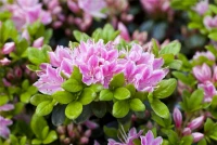 Rhododendron obtusum ‚Kermesina Rose‘ bildet von Ende Mai bis Anfang Juni zahlreiche trichterförmige, rosa-weiße Blüten. Diese werden etwa 2 – 3 cm groß.