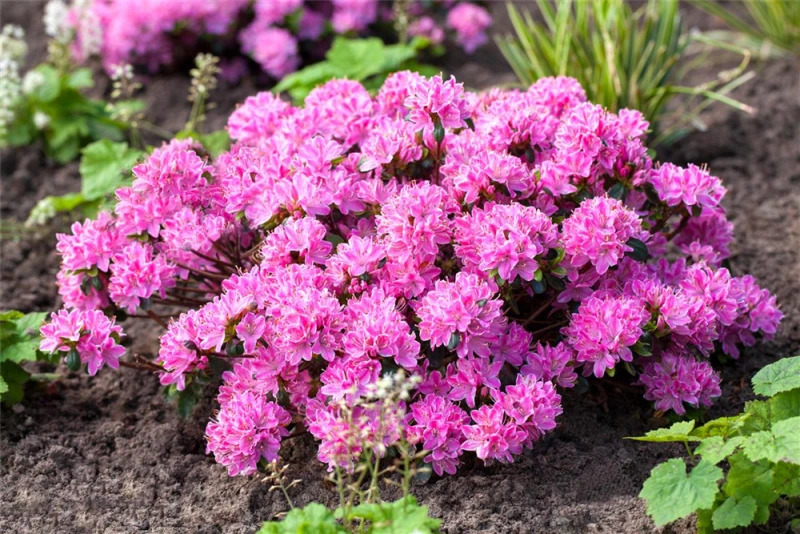 Rhododendron obtusum ‚Kermesina Rose‘ ist ein Flachwurzler und bildet, je nach Boden, fein verzweigte Wurzeln.