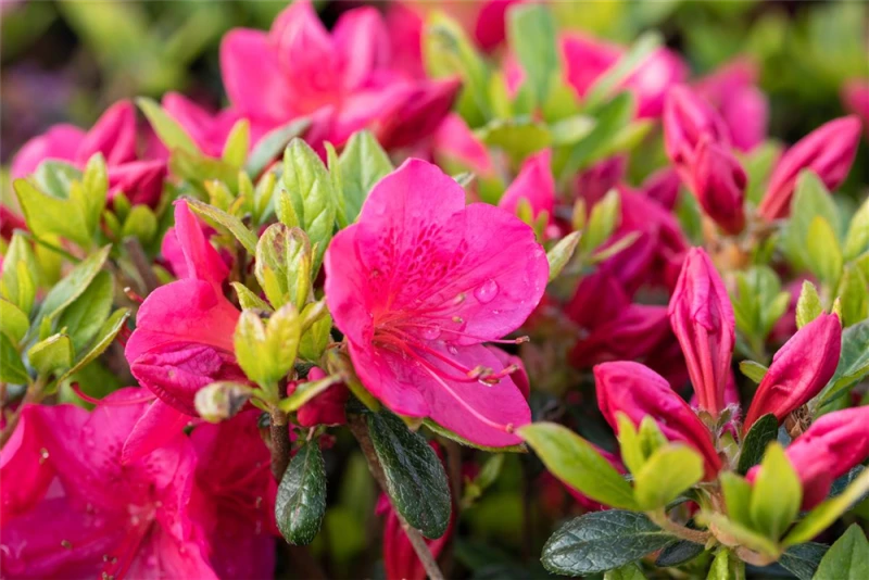 Die Japanische Azalee ‚Little Red‘ ist wintergrün und trägt dunkelgrüne Blätter.