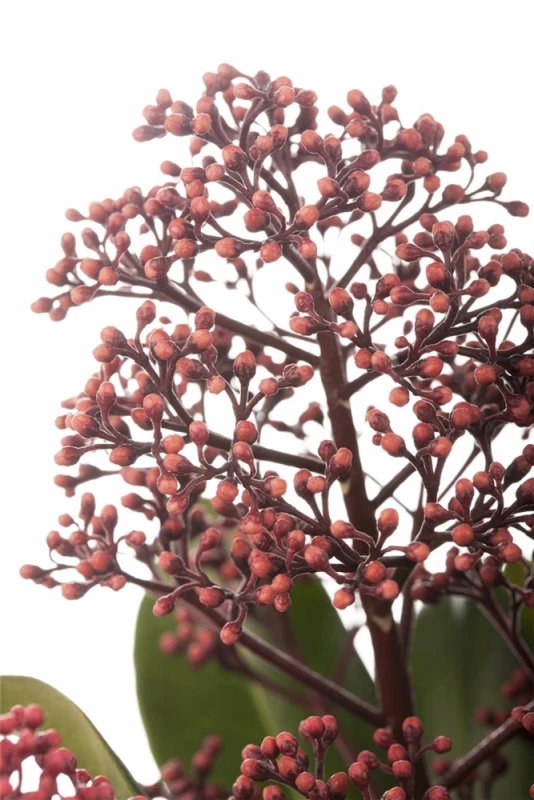 Die roten Blüten der Japanischen Blütenskimmie ‚Rubella‘ erscheinen in Rispen von April bis Mai. Diese sind stark duftend.