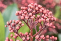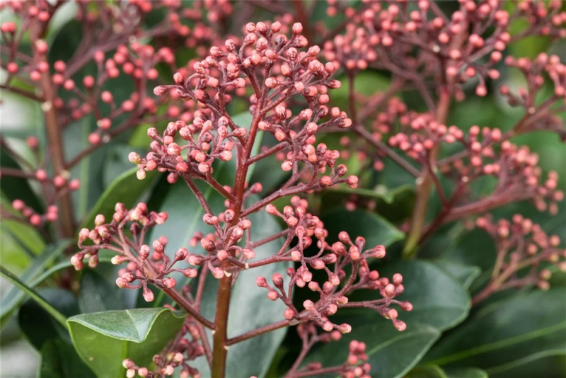 Die Japanische Blütenskimmie ‚Rubella‘ (Skimmia japonica) ist ein buschiger, kompakter Kleinstrauch, der rote, in Rispen angeordnete Blüten mit einem starken Duft hervorbringt. Sie erscheinen von April bis Mai. An einem halbschattigen bis schattigen, windgeschützten Standort mit durchlässigem, humosem, saurem Boden erreicht sie gewöhnlich eine Höhe von ca. 1 m und wird ca. 1,5 m breit.