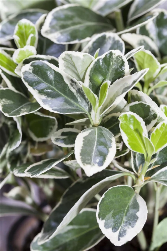 Hoher Blattschmuckwert. Die immergrünen Blätter der Japanspindel ‚Gray Beauty‘ sind dunkelgrün und weisen einen weißen Rand auf.