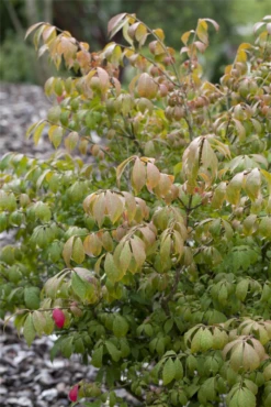 Der Korkflügelstrauch ‚Compactus‘ (Euonymus alatus) ist ein aufrechter, breiter, dichter Kleinstrauch mit dekorativen, orange-roten Früchten. Die grüngelben, in Trauben angeordneten Blüten erscheinen von Mai bis Juni.