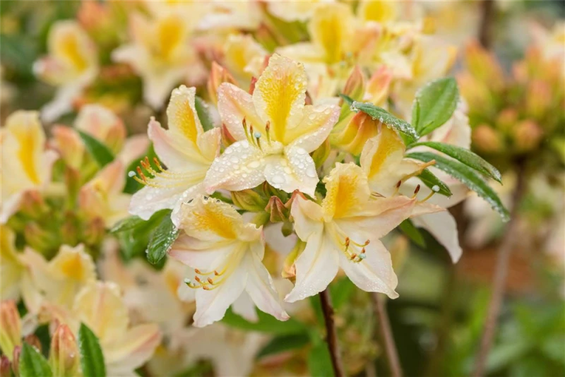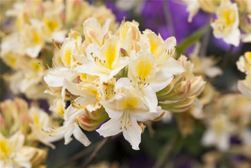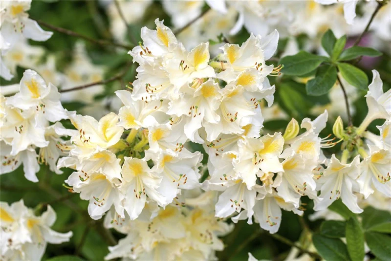 Die Sommergrüne Azalee ‚Daviesii‘ (Rhododendron luteum) bringt von Mitte Mai bis Ende Juni ein wahres Meer aus cremeweißen Blüten hervor. Dieses breit, locker wachsende Gehölz erreicht gewöhnlich eine Höhe von 1,2 – 1,4 m und eine Breite von 1,4 bis 1,6 m. Ein halbschattiger (bis schattiger) Standort und ein humoser, kalkfreier Boden schaffen optimale Bedingungen für ein gesundes Wachstum. Die Sommergrüne Azalee ‚Daviesii‘ ist gut frostverträglich.