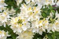 Rhododendron luteum ‚Daviesii‘ bildet von Mitte Mai bis Ende Juni zahlreiche in Dolden angeordnete, cremeweiße Blüten. Diese verströmen einen starken Duft.