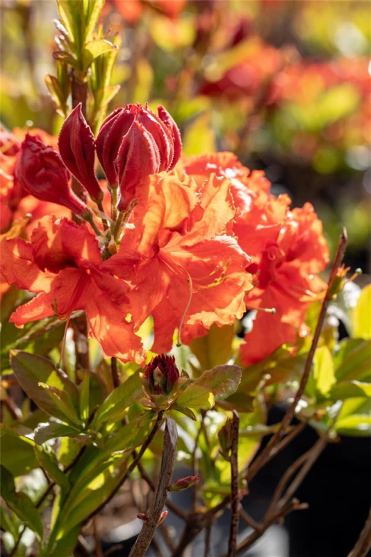 Die Sommergrüne Azalee ‚Gibraltar‘ (Rhododendron luteum) bringt von Ende Mai bis Mitte Juni ein wahres Meer aus kupferorangen Blüten hervor. Dieses kompakt wachsende Gehölz erreicht gewöhnlich eine Höhe von 1 – 1,5 m und eine Breite von 1,5 bis 2 m. Ein halbschattiger (bis schattiger) Standort und ein humoser, kalkfreier Boden schaffen optimale Bedingungen für ein gesundes Wachstum. Die Sommergrüne Azalee ‚Gibraltar‘ ist gut frostverträglich.