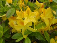 Rhododendron luteum ‚Goldtopas‘ bildet von Ende Mai bis Mitte Juni zahlreiche trichterförmige, in Dolden angeordnete, gelbe Blüten. Diese verströmen einen angenehmen Duft.