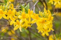 Die Sommergrüne Azalee ‚Goldtopas‘ (Rhododendron luteum) bringt von Ende Mai bis Mitte Juni ein wahres Meer aus gelben Blüten hervor. Dieses aufrecht, buschig, breit, kompakt, verzweigt wachsende Gehölz erreicht gewöhnlich eine Höhe von 1 – 1,2 m und eine Breite von 1,2 bis 1,6 m. Ein halbschattiger (bis schattiger) Standort und ein humoser, kalkfreier Boden schaffen optimale Bedingungen für ein gesundes Wachstum. Die Sommergrüne Azalee ‚Goldtopas‘ ist gut frostverträglich.