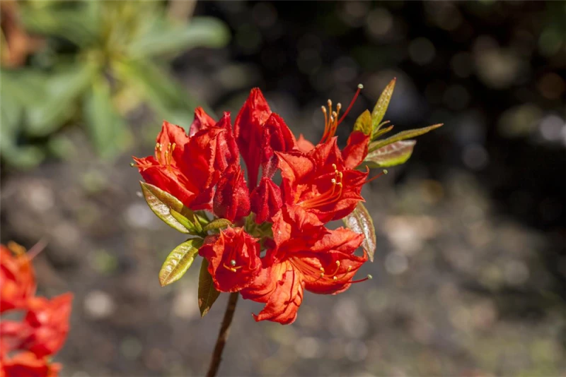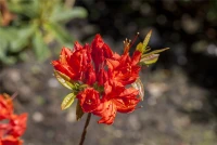 Die Sommergrüne Azalee ‚Royal Command‘ (Rhododendron luteum) bringt von Mitte Mai bis Ende Juni ein wahres Meer aus orange-roten Blüten hervor. Dieses aufrecht wachsende Gehölz erreicht gewöhnlich eine Höhe von 2 – 3 m und eine Breite von 2 bis 3 m. Ein halbschattiger (bis schattiger) Standort und ein humoser, kalkfreier Boden schaffen optimale Bedingungen für ein gesundes Wachstum. Die Sommergrüne Azalee ‚Royal Command‘ ist gut frostverträglich.