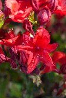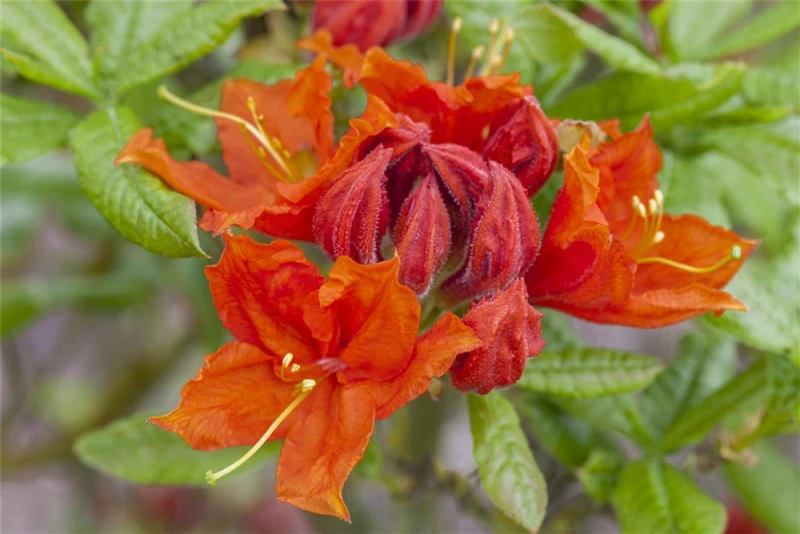 Rhododendron luteum ‚Royal Command‘ bildet von Mitte Mai bis Ende Juni zahlreiche in Dolden angeordnete, orange-rote Blüten. Diese verströmen einen starken Duft.