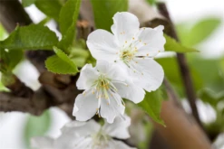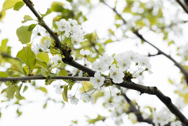 Prunus avium ‚Büttners Rote Knorpelkirsche‘ bildet weiße Blüten ab April. Diese verströmen einen angenehmen Duft und werden etwa 2 – 3 cm groß.