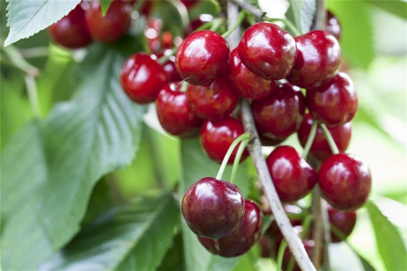 Prunus avium ‚Burlat‘ bildet dunkelrote, runde Früchte.