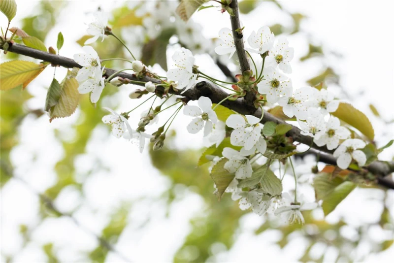 Prunus avium ‚Große Prinzessinkirsche‘ bildet weiße Blüten ab April. Diese verströmen einen angenehmen Duft und werden etwa 2 – 3 cm groß.