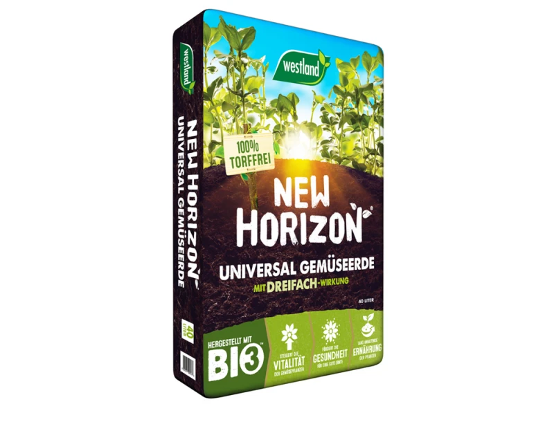 Mit der Westland New Horizon Universal Gemüseerde und ihrer innovativen torffreien BIO3 Erdenmischung eröffnet Westland neue Horizonte für den nachhaltigen Anbau von Gemüse. Die Basis der Erdenmischung bildet eine eigens entwickelte, nährstoffreiche Bio-Faser aus 100 % natürlichen Inhaltsstoffen. Gemeinsam mit dem West+ Wassermanagement-System und dem wasser- und nährstoffspeichernden Kokos+ bildet sie beste Voraussetzungen für eine gute und ertragreiche Gemüseernte.