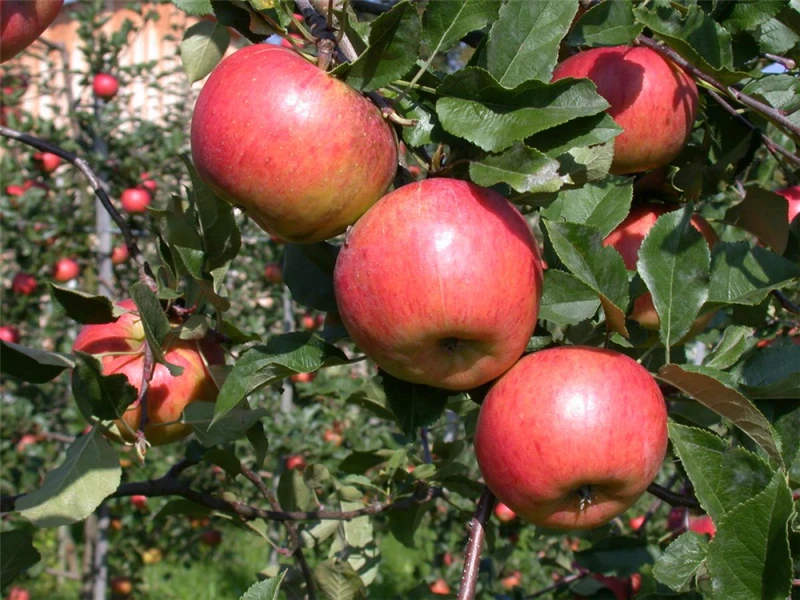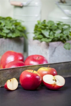 Der Winterapfel ‚Topaz'(s) (Malus domestica) bildet orange-rote, mittelgroße, feste Früchte. Sie haben einen süß-säuerlichen, aromatischen Geschmack. Für eine ertragreiche Ernte ab September schaffen durchlässiger, nährstoffreicher Boden und ein sonniger bis halbschattiger Standort optimale Bedingungen. Auch seine hellrosafarbenen Blüten sind eine schöne Erscheinung.