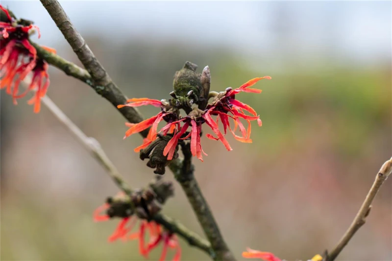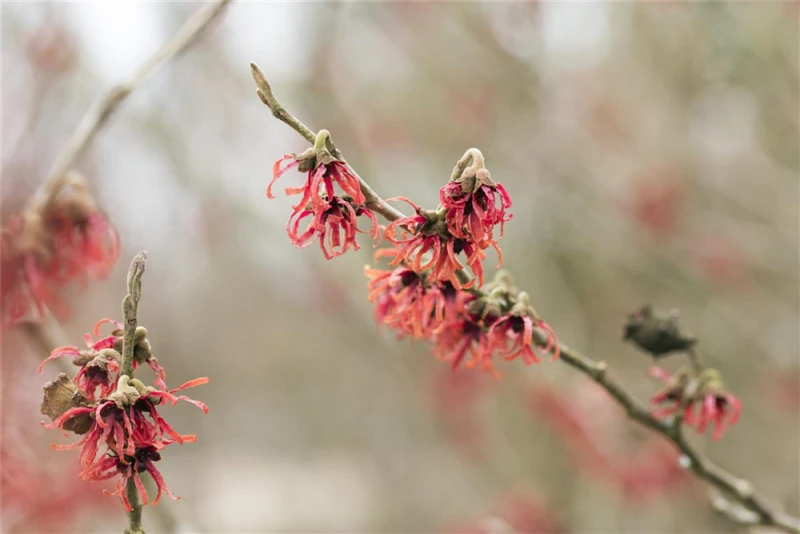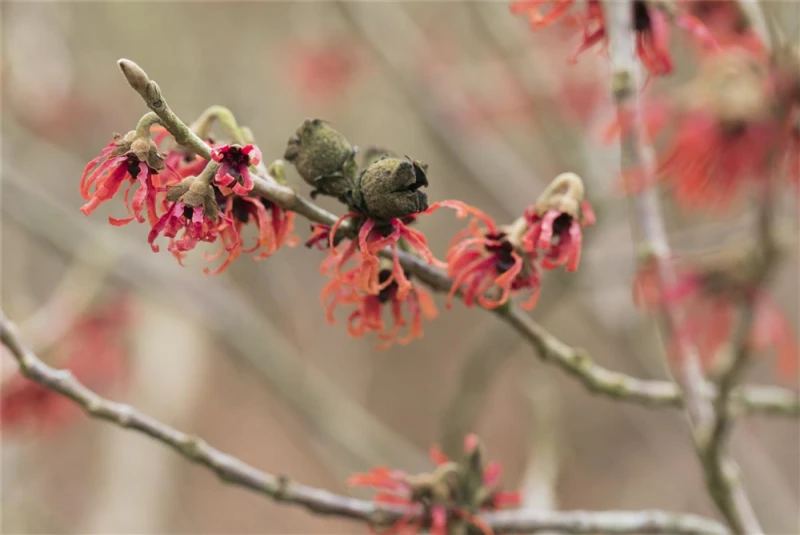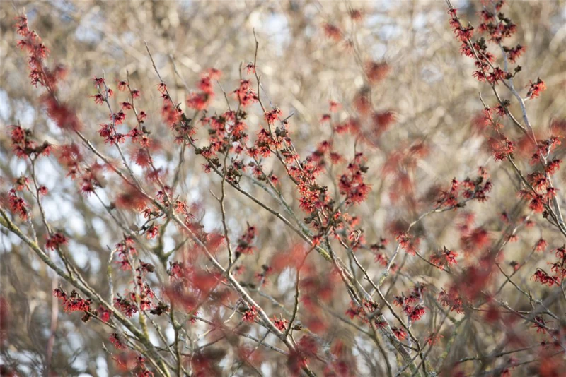 Hamamelis x intermedia ‚Diane‘ gedeiht auf allen sauren, humosen und genügend feuchten Böden.